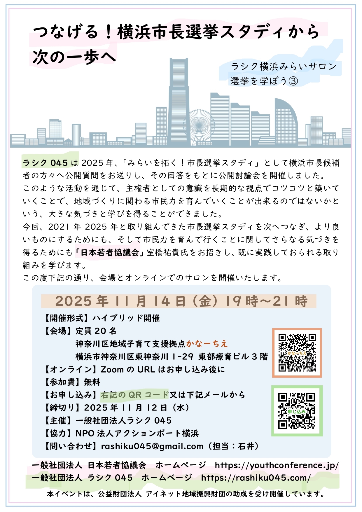 今年度前半、「ラシク横浜みらいサロン」と称し、横浜市長選挙を取り巻く様々な視点から、3回シリーズで取り組んできました。